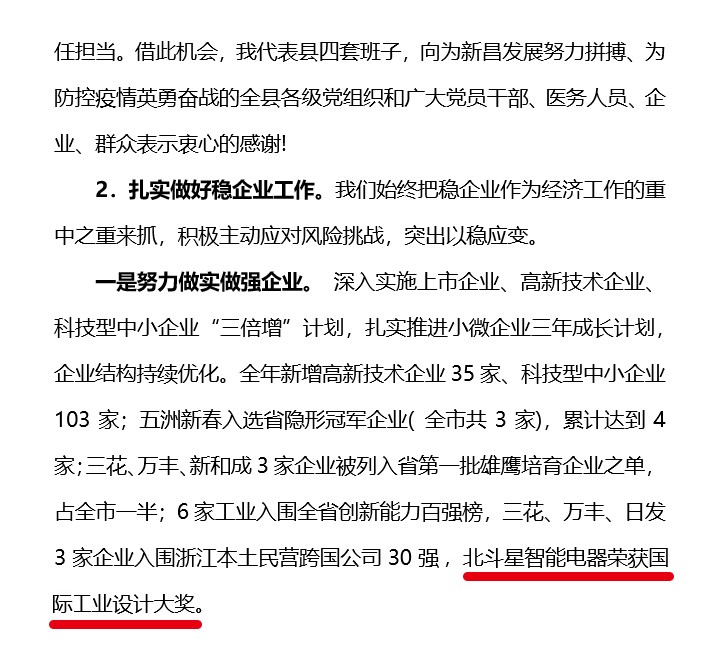 在大會上,新昌縣委書記李寧還點名表揚了北斗星智能電器榮獲國際工業(yè)設(shè)計大獎。