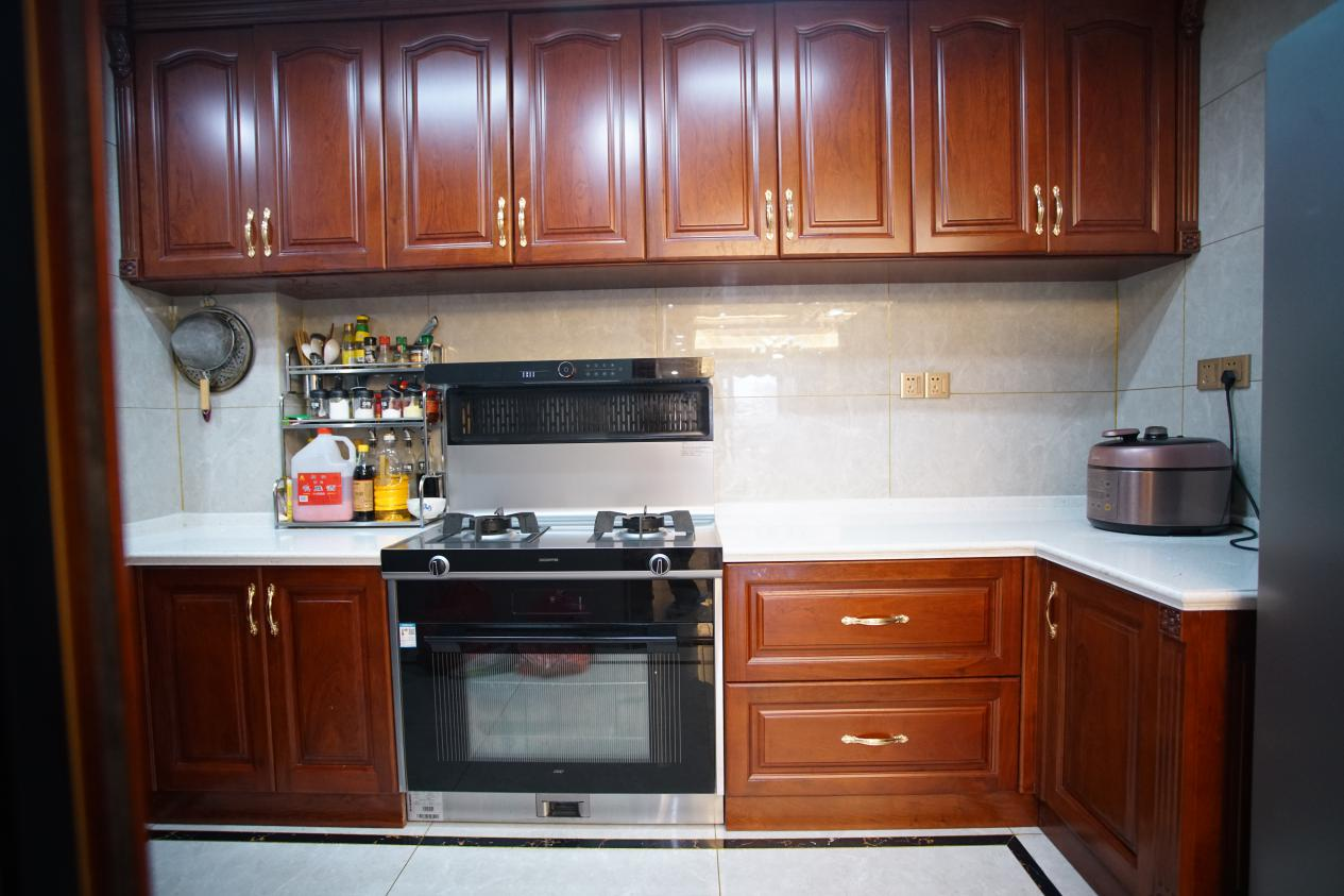 整個(gè)廚房的設(shè)計(jì)有別于傳統(tǒng)中式風(fēng)繁復(fù)富麗、濃墨重彩的特點(diǎn),而是以高雅配色和簡(jiǎn)約線條設(shè)計(jì),將經(jīng)典與時(shí)尚結(jié)合,打造極具現(xiàn)代生活特色的極簡(jiǎn)新中式廚房。柜區(qū)選用沉穩(wěn)的“菩提棕”木紋配色,視覺上營(yíng)造穩(wěn)重之感,深淺層次分明,讓廚房顯得低調(diào)而有內(nèi)涵。