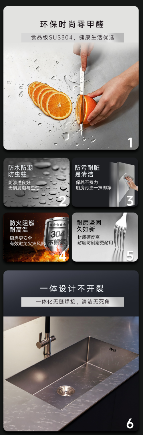 第三、烹洗更健康。消費者對于廚房的訴求,除了美觀和多功能性,還要有更大的便捷性,烹飪凈洗健康,下廚要成為一種享受。不銹鋼集成廚房產品不僅融合不銹鋼材質賦予廚房出色的耐用性、易于清潔、安全、環保無甲醛等優點,讓廚房的日常維護變得輕松簡單。